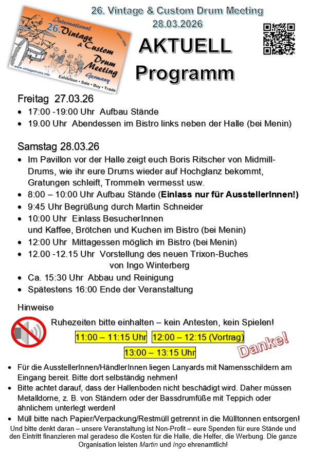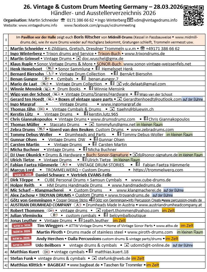 the Frankfurter Musikmesse near by. Back then and today the idea is to create a forum for friends and collectors of historic drum sets. In the 1990s it wasn’t as easy as it is today, to find information in the internet or subject literature like the books by Rob Cook for instance. So the exchange of information and exhibits of drum collections were in the foreground. In recent years, the VDM also became a collectors’ fair and flea market for old drums and accessories. The VDM is attended by about 30 exhibitors and 250 visitors from the vintage scene with a rising participation of international parties. Every VDM has a main topic, usually a drum maker such as Ludwig, Sonor, Trixon etc. which is presented by a collector and expert. Clinics and a raffle with attractive prices complete the picture and make the VDM a fun event one would not want to miss. |
